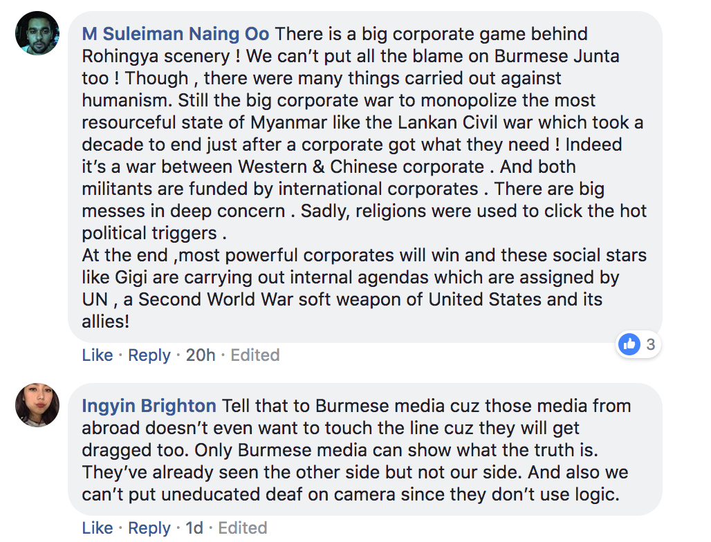 Commenters then chimed in with theories of a an international conspiracy to ignore Myanmar’s suffering at the hands of Rohingya militants.