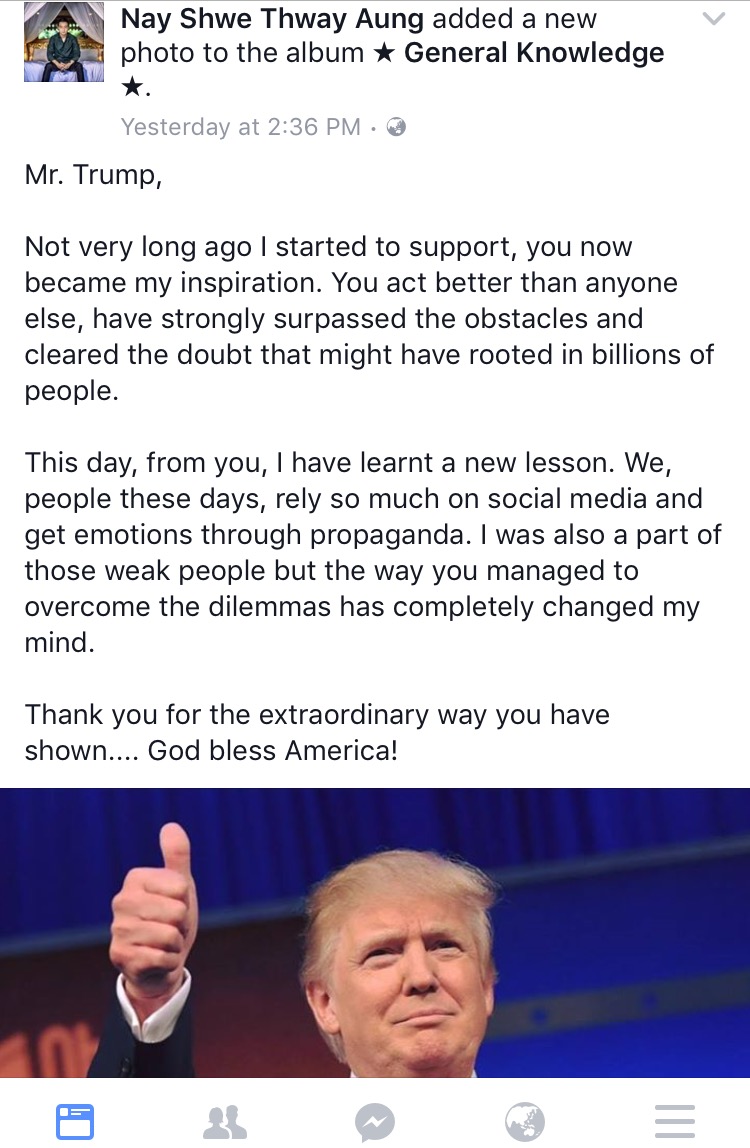 Nay Shwe Thway Aung, the grandson of former dictator Senior General Than Shwe, posted a statement on his Facebook page yesterday commending US President-Elect Donald Trump for “act[ing] better than anyone else” and for changing the young man’s mind about “rely[ing] so much on social media and get[ting] emotions through propaganda”.
