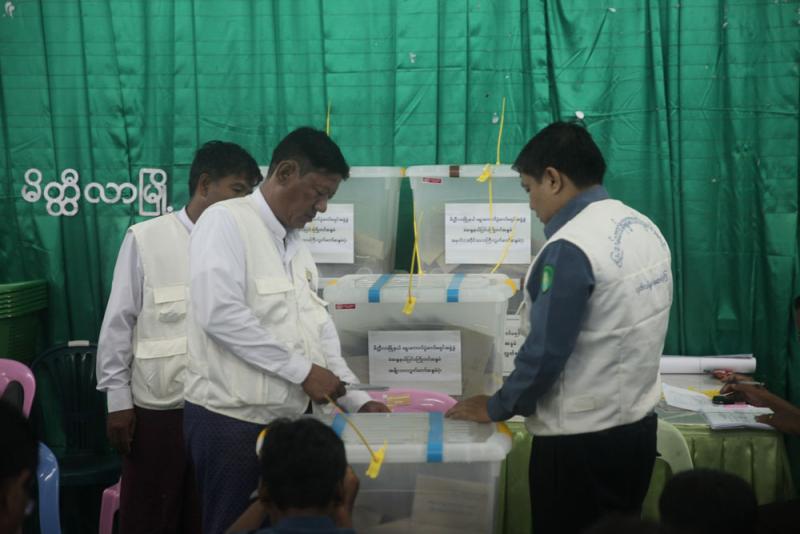 Officials at the office of the Meikhtila Township Election Commission on the evening of the election on November 8. Photo / Myanmar Now / Phyo Thiha Cho