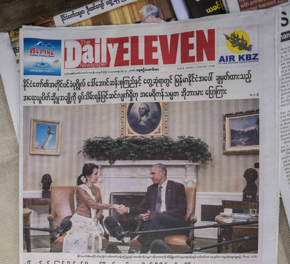 Daily Eleven, meanwhile, ran those photos of the friendly handshake between Suu Kyi and Obama with a story on the sanctions news.