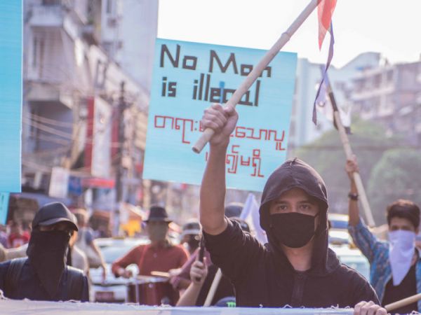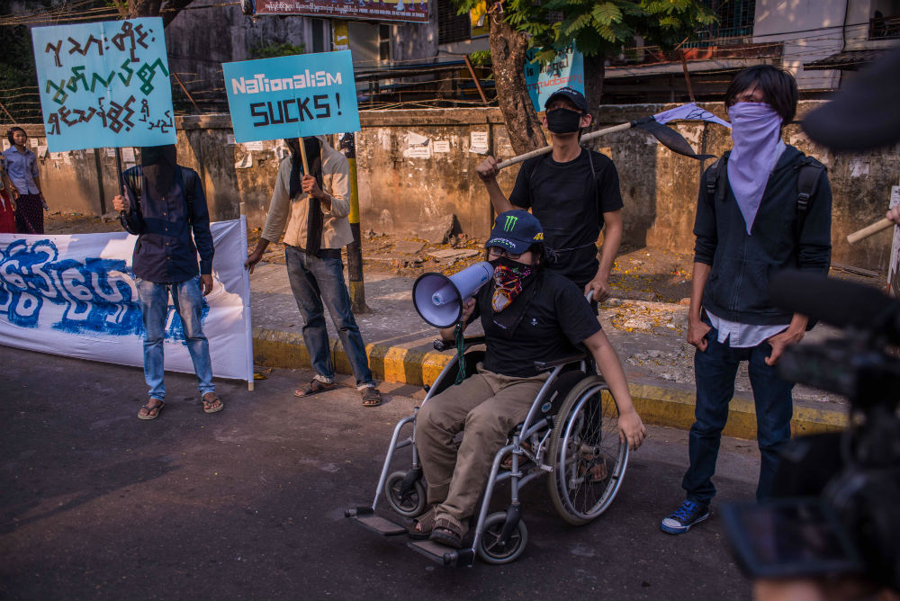 An activist speaks out against discrimination during a rally in Yangon on April 25. Photo: Aung Naing Soe / Coconuts Yangon