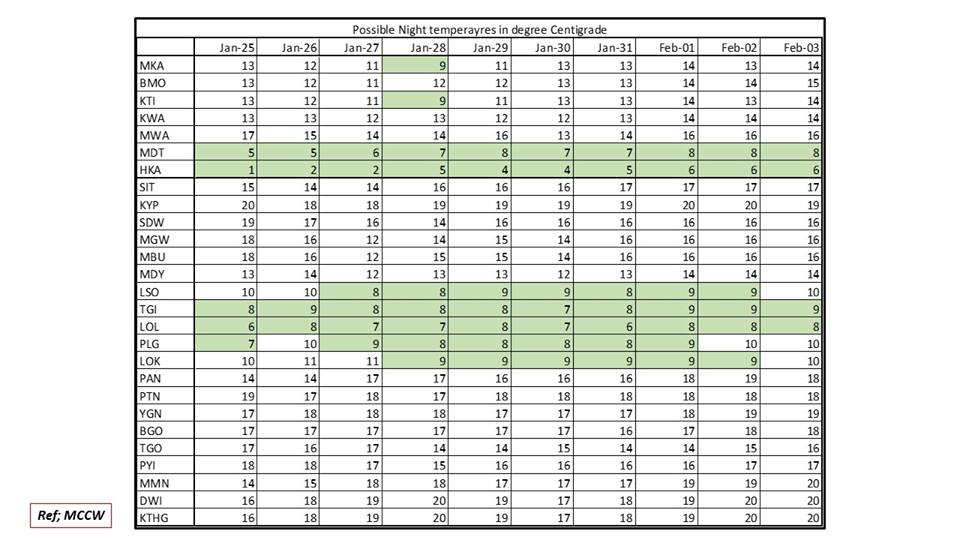 In Yangon, temperatures could dip to 17 degrees while some places, including Lashio in Shan state, are expecting to slip into the single digits.