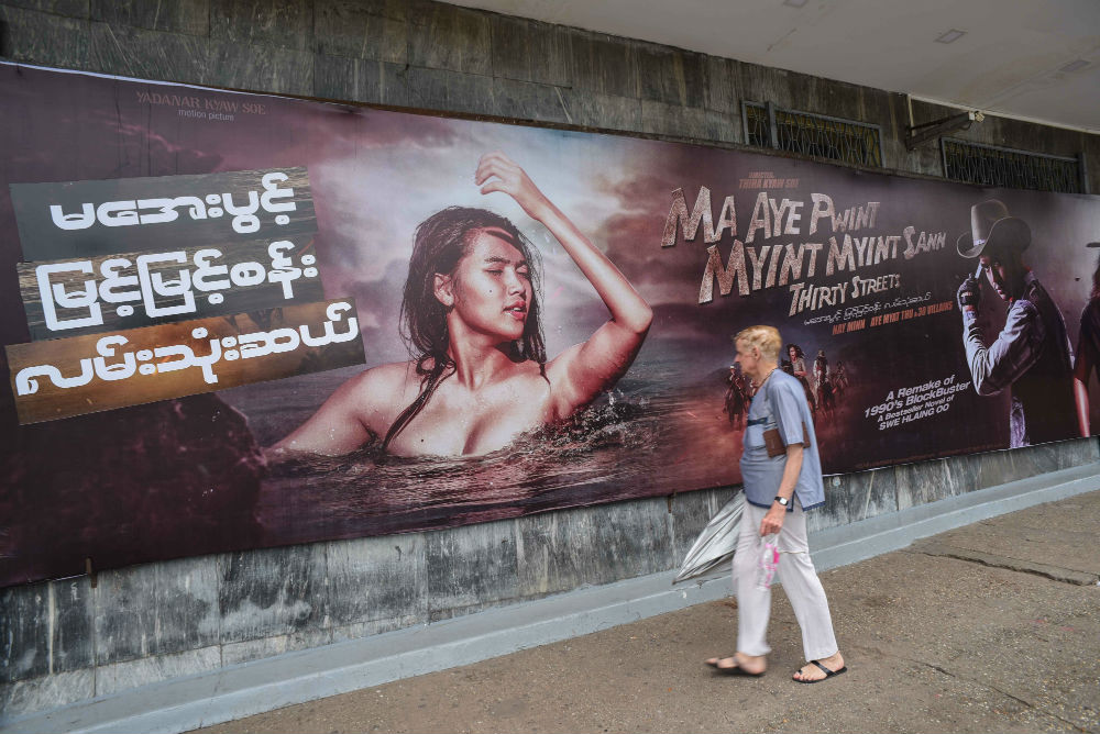 The ad is typical of Myanmar movie posters in most ways but for one: the unmissable cleavage of voluptuous actress Aye Myat Thu.