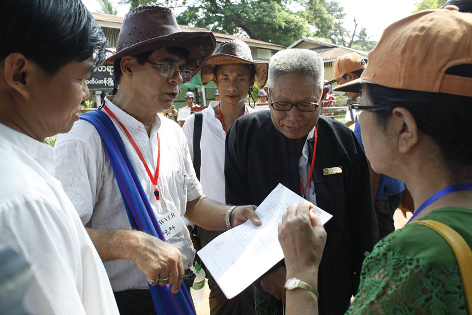 Robert San Aung (second from left), the lawyer representing detained students, at Letpadan Township Court on April 23, 2015. PHOTO/COCONUTS MEDIA