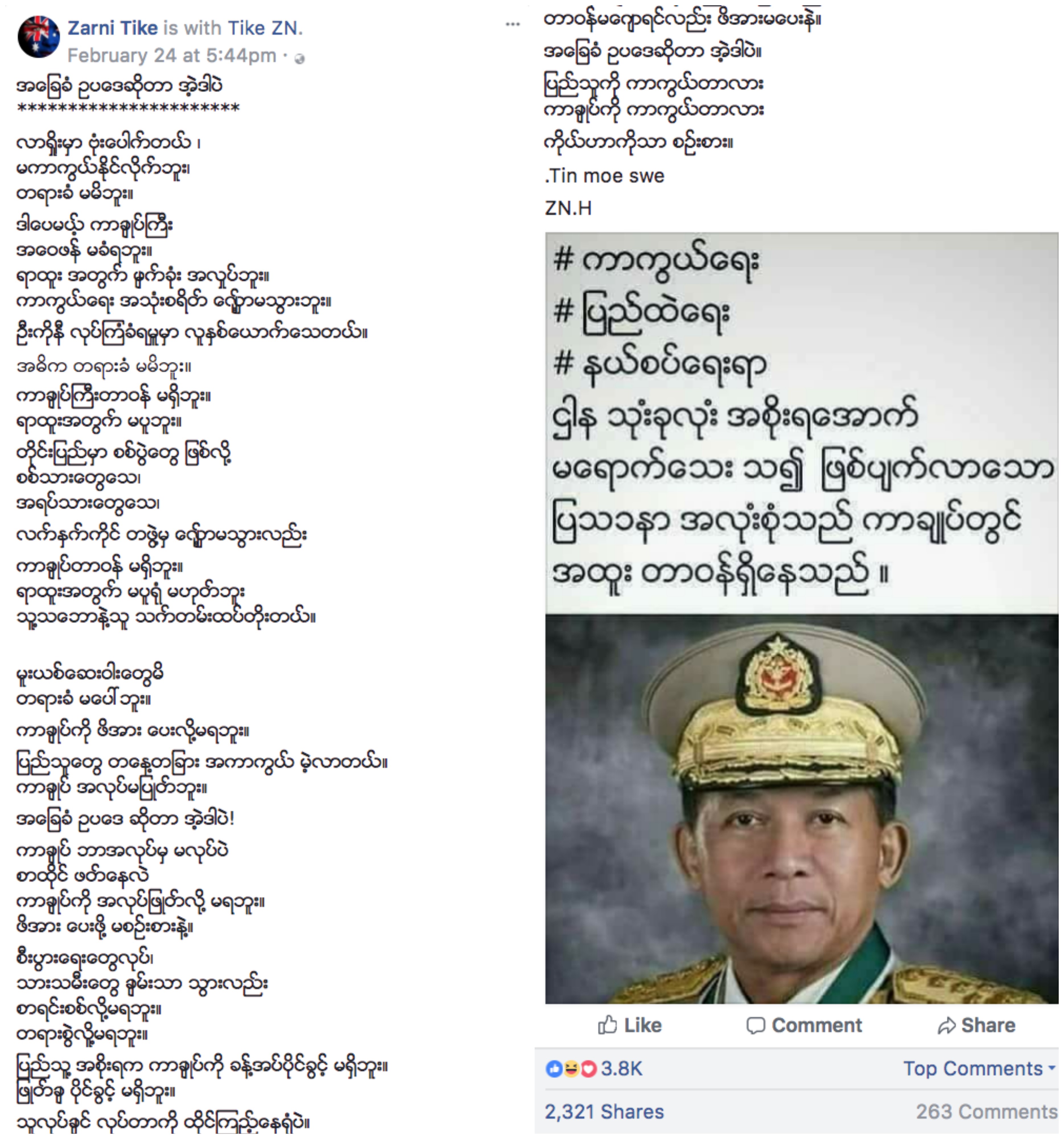 Criticizing the military, once Myanmar’s defining pastime, has grown rare since security forces started winning over hearts and minds by committing acts of genocide against the Rohingya. But one Facebook user wants to bring the fad back, starting with a long-form Facebook post that has received more than 2,300 shares and 3,800 reactions since Feb. 24.