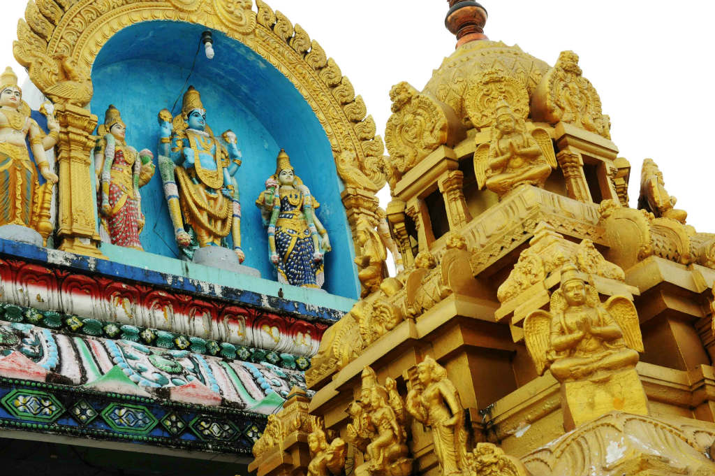 The complex contains a very large traditional gopuram over the front entrance and column-strewn covered walkways along most of the perimeter around its various shrines. At its center is the main prayer hall covered in sculptures of deities and paintings depicting scenes from lore, with a fantastic portico supported by 16 ornate pillars at the front.