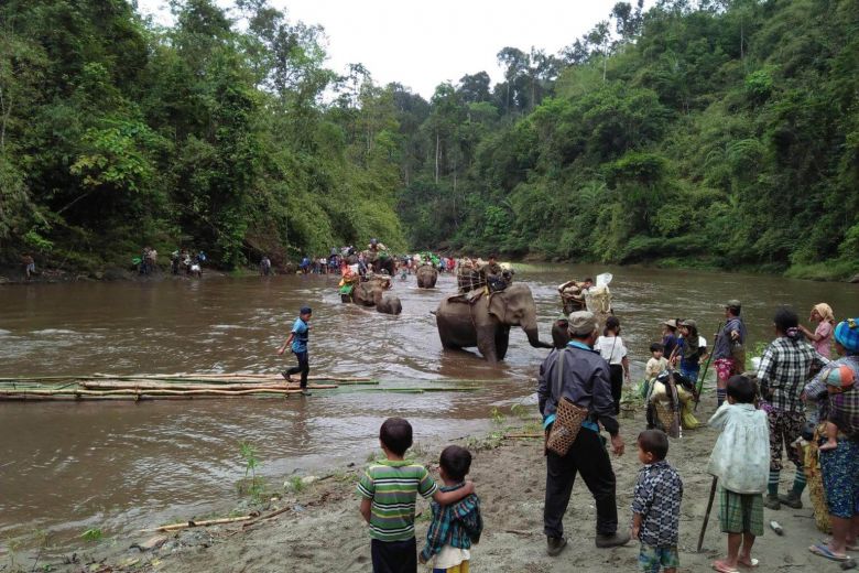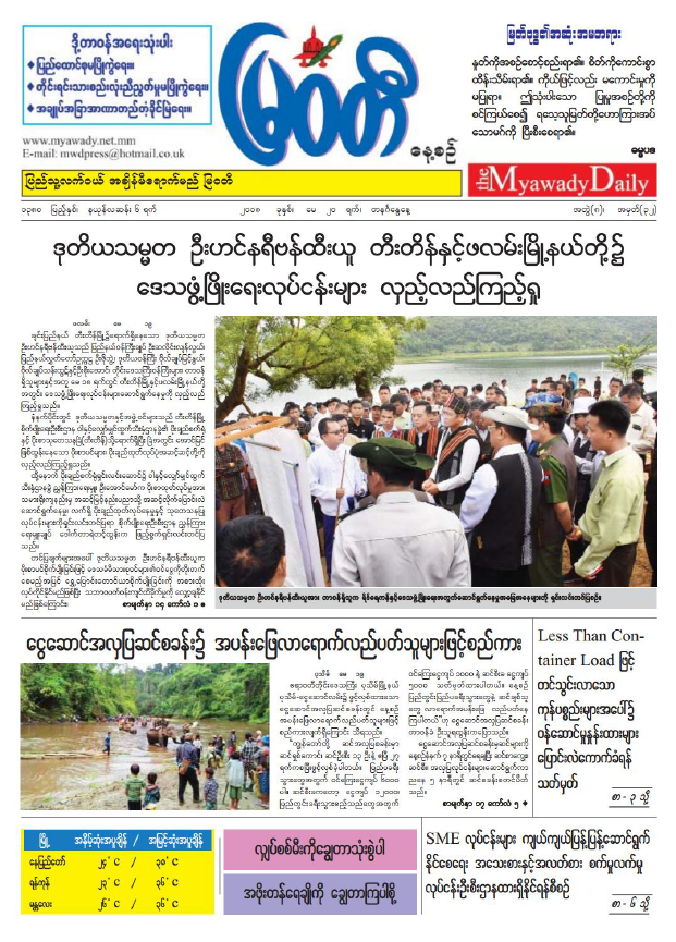 Myanmar’s military-run newspaper Myawady published a photo on its front page yesterday showing displaced villagers in Kachin State fleeing across a river with the help of elephants. However, instead of accompanying an article about the war the military is waging in that area or the thousands of people it has displaced, the photo appeared under the irrelevant headline “Ngwe Saung Elephant Camp is alive with visitors.”