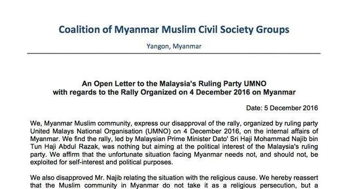 The Coalition of Myanmar Muslim Civil Society Groups sent a letter to Malaysia’s ruling party Umno yesterday, calling the party out on its political capitalization on the Rohingya crisis in Rakhine State.