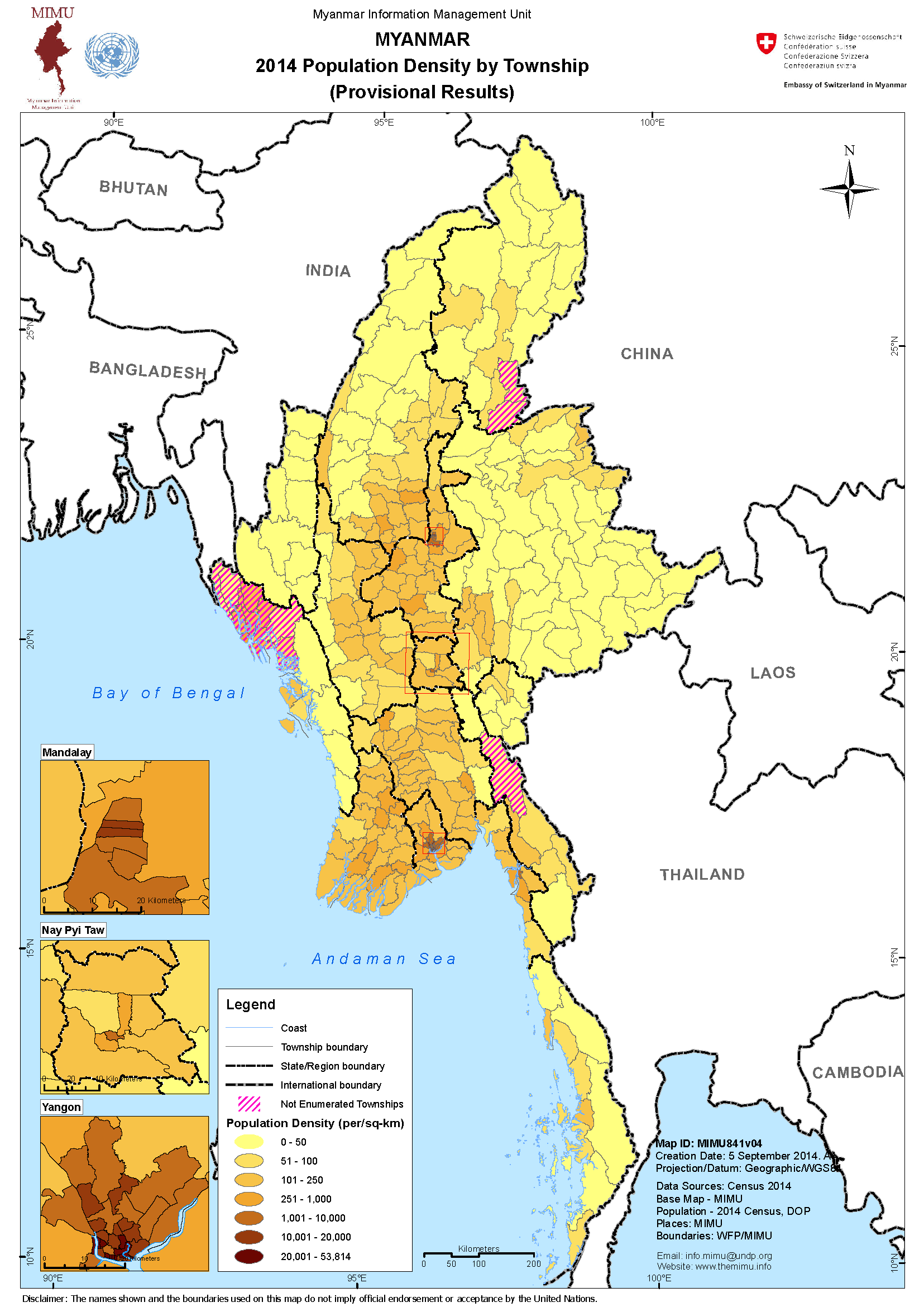 Based on a total population of 51.486 million, the average township population in Myanmar is about 156,000 people, but ranges from 1,732 people in tiny Injangyang in Kachin State in the north to 687,867 residents in Yangon’s sprawling Hlaing Tharyar Township.