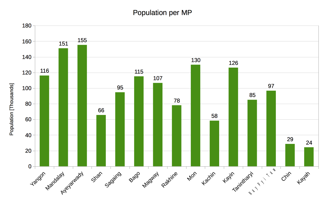 The disparity becomes even more apparent when calculating how many constituents each Lower House lawmaker represents. The numbers range from 24,000 constituents per lawmaker (Kayah State) to 155,000 (Ayeyarwaddy Region).