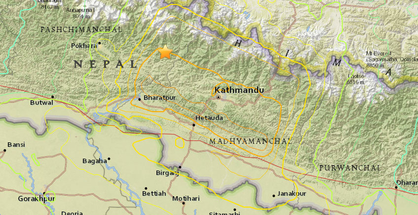 Map of Nepal showing where the earthquake hit between Kathmandu and Pokhara. WWW.USGS.GOV