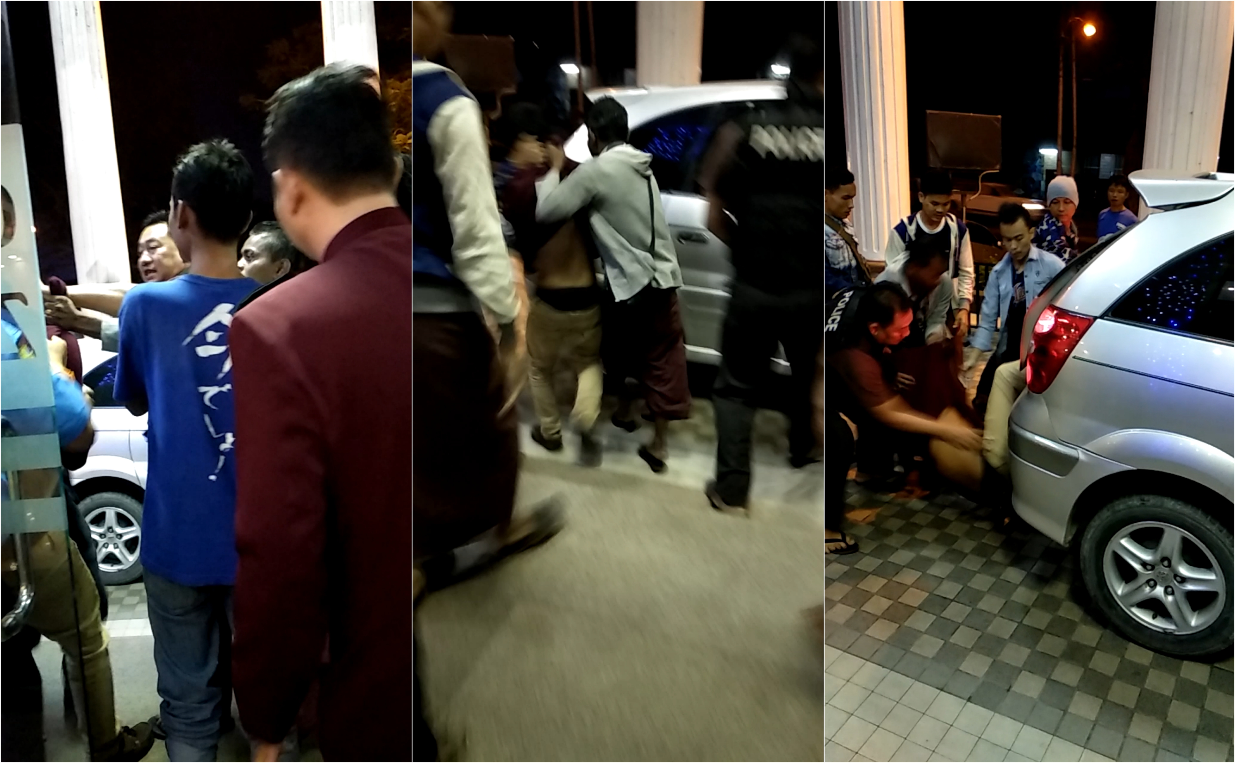 The security guards drag Than Toe Aung out of the building and hand him to the police officers, who try to force him into the back of a van. One of the police officers can be seen wearing a black vest with the word “POLICE” on it. Than Toe Aung claims he thought the men were racist thugs before he noticed the police vest while he was being dragged out of the hotel.