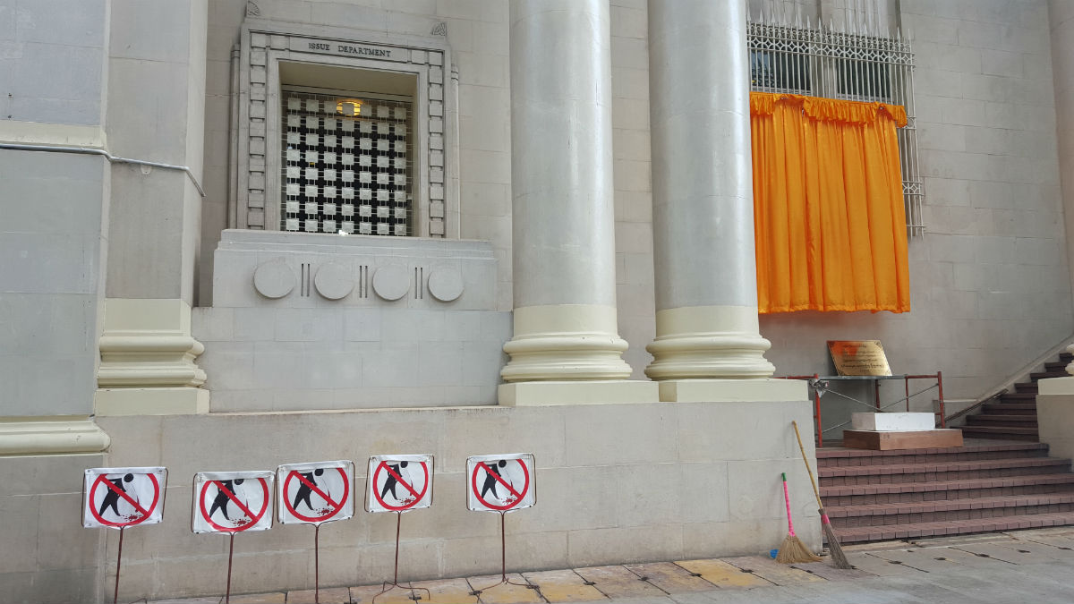 Several signs posted out front of the former reserve Bank of India building on Mahabandoolah and Sule Pagoda road warn against the practice.