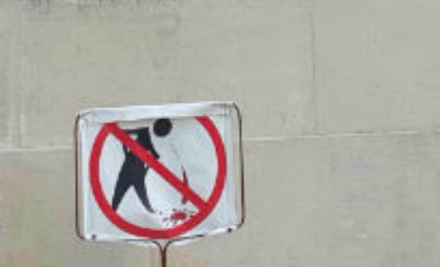 The signs resemble others around the city. Stick-like figure. Red spit flying toward ground.