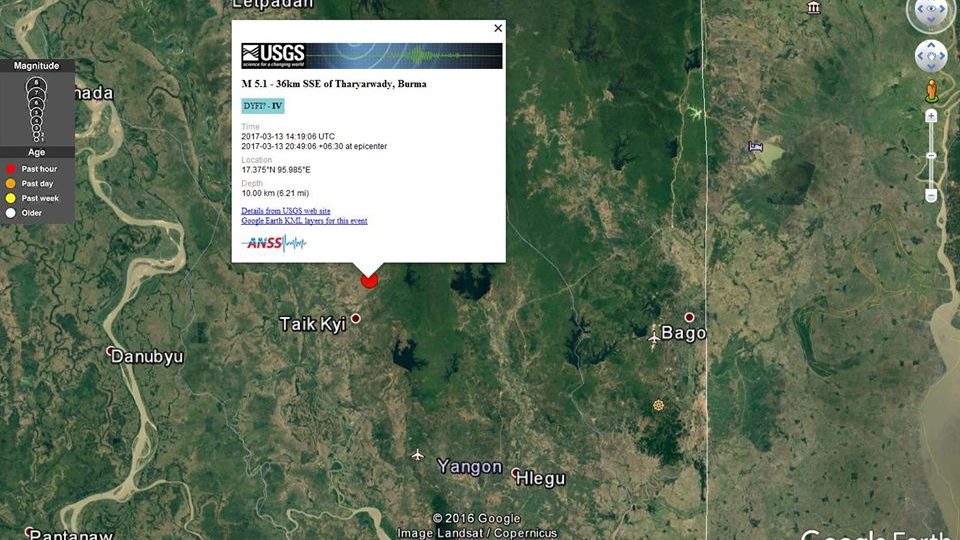 This week’s quake struck near Taikkyi Township in northern Yangon Region and was followed by several weaker tremors, altogether damaging several buildings and injuring 26 people.