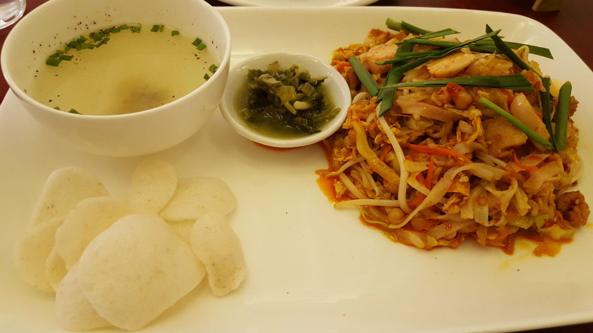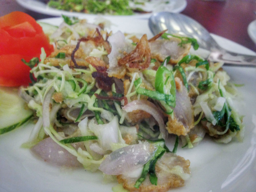 To kick things off we had two salads: tamarind leaf and fish cake (about $2 each), two offerings you don’t always see on menus with the expected tea leaf and pennywort varieties (they have those too).