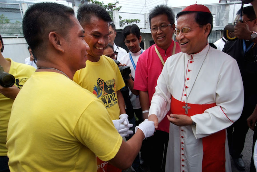 Cardinal Charles Maung Bo of Yangon, papal envoy to the International Eucharistic Congress in the Philippines, greet inmates at Cebu’s maximum security prison during a visit on Jan. 26. Photo by Angie de Silva / UCA News