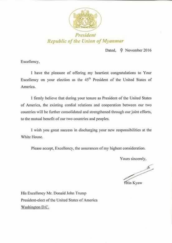 Myanmar President Htin Kyaw released the following statement on the Facebook page for the President’s Office today: