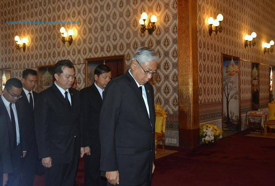 According to the Facebook page of the President’s Office, President Htin Kyaw and his entourage left to Thailand at 10am on November 9 and went to the Dusit Maha Prasat Throne Hall to present a wreath of flowers in honor of the late king and to sign the royal record book.