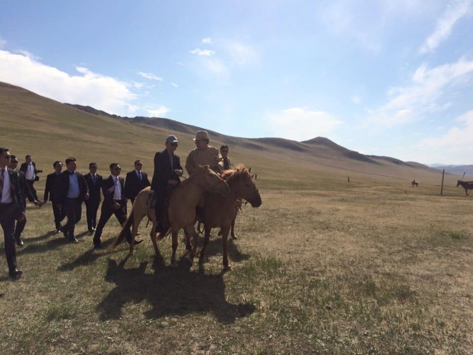 Mongolia is, of course, famous for its equestrian culture, which makes its way into the halls of government, as another photo from the trip of horses lining a state building shows.