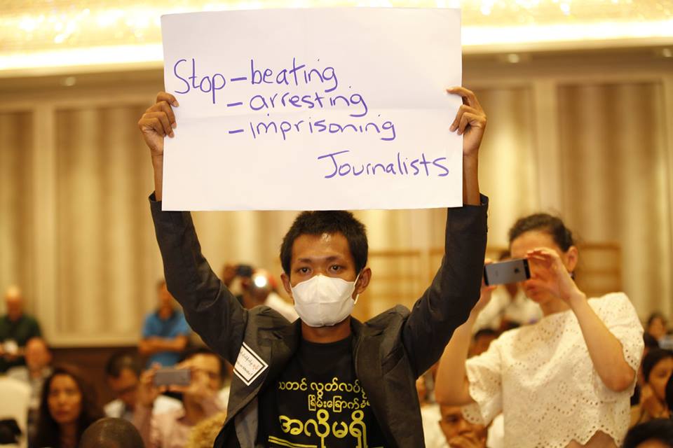 A solo protester interrupted a speech by Information Minister Ye Htut at an international media conference in Yangon this morning, holding up a sign that implored the Myanmar government to ‘stop beating, arresting, imprisoning journalists”.