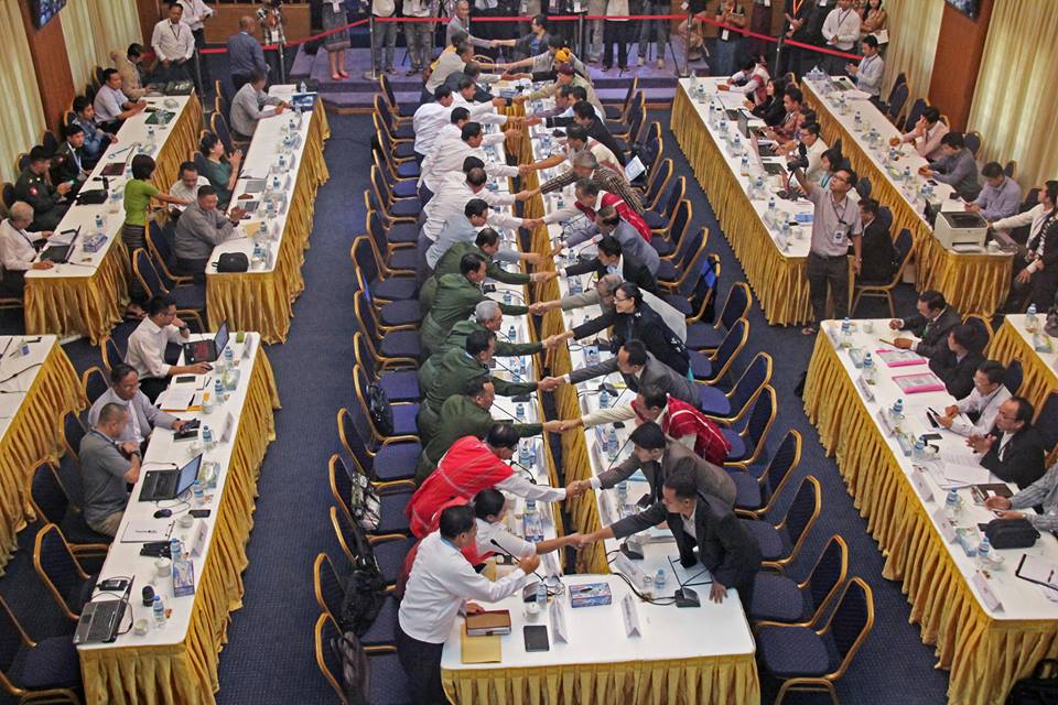 Parties to negotiations shake hands during talks on March 30, 2015. FACEBOOK/MYANMAR PEACE CENTER