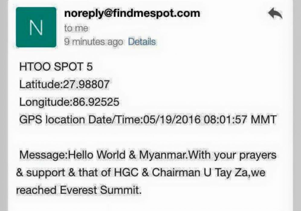 They achieved their goal at 7:17am Nepal time, according to a post on the Facebook page, which also had a screenshot of this message: “Hello World and Myanmar. With your prayers & support and & that of HGC & Chairman U Tay Za, we reached Everest Summit.”