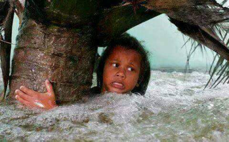 Take the above image of a young girl neck-deep in water, clinging onto a tree, which was shared widely on Facebook.