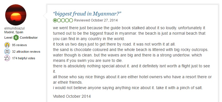 Ngapali Beach? “Biggest fraud in Myanmar,” wrote one commenter, “the beach is just a normal beach that you can find in any country in the world.”