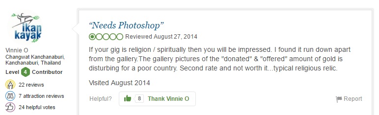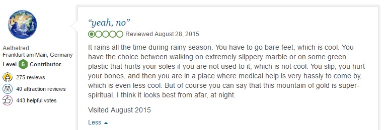 And travel review website TripAdvisor brings out the worst of them. This article on the world’s grumpiest travelers inspired us to do our own assessment of the verdicts on Myanmar tourist sites.