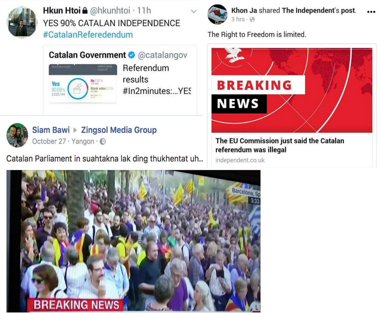 “Actually, many of us envy [the Catalonians],” said Khon Ja, a Kachin humanitarian worker and resident of Banmaw, Kachin State. “They have a chance to express their willingness to be independent. We had the same feeling during Scottish referendum.”