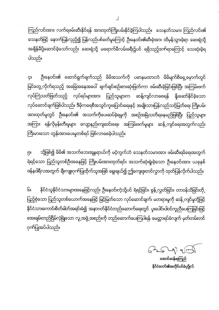 “As citizens, we call on you to emulate U Ne Win’s sacrifice, bravery, and sense of duty, and do the noble thing and oppose injustice [in any situation] in order to help us as we work together towards the future of our country and build a safe and peaceful nation.”