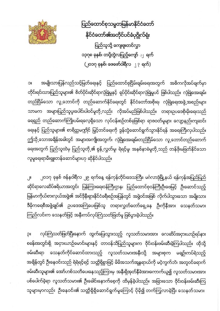 Echoing the NLD’s earlier description of the murder as a ‘terrorist act’, Suu Kyi’s statement reads, “As we transition into a democracy and unite the people, we will always remember U Ne Win’s sacrifice; for citizens, it is an encouragement to fight against terrorism and oppose violence.”