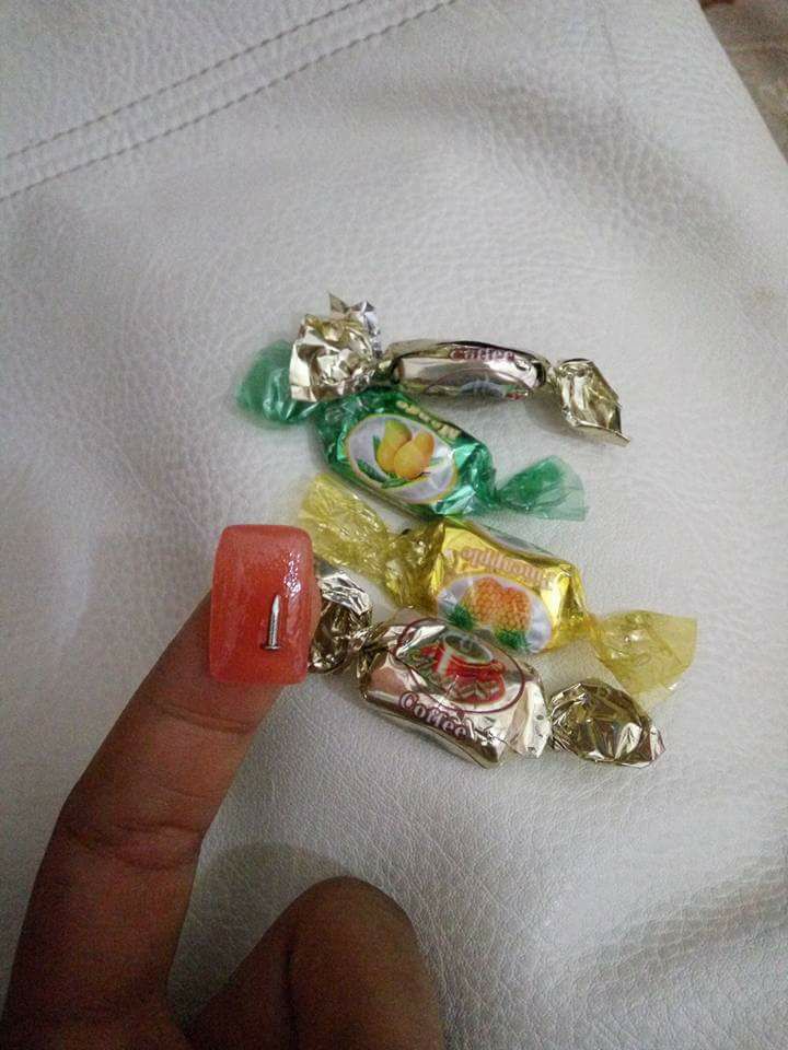Well here’s something that’s definitely not sweet — earlier this week, Facebook user Daw Khin Khin Thein uploaded this photo of a nail that she found inside a piece of candy. As in, a metal tack that was somehow poured into the candy as it was being made.