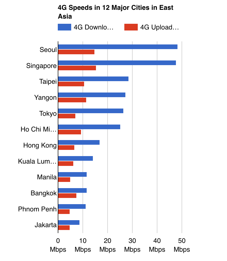 The report covered 12 major cities in the region and measured upload and download speeds over a three-month period. Just two years after the introduction of 4G service in Myanmar, Yangon averaged download speeds of over 27 Mbps and upload speeds of 11.4 Mbps.