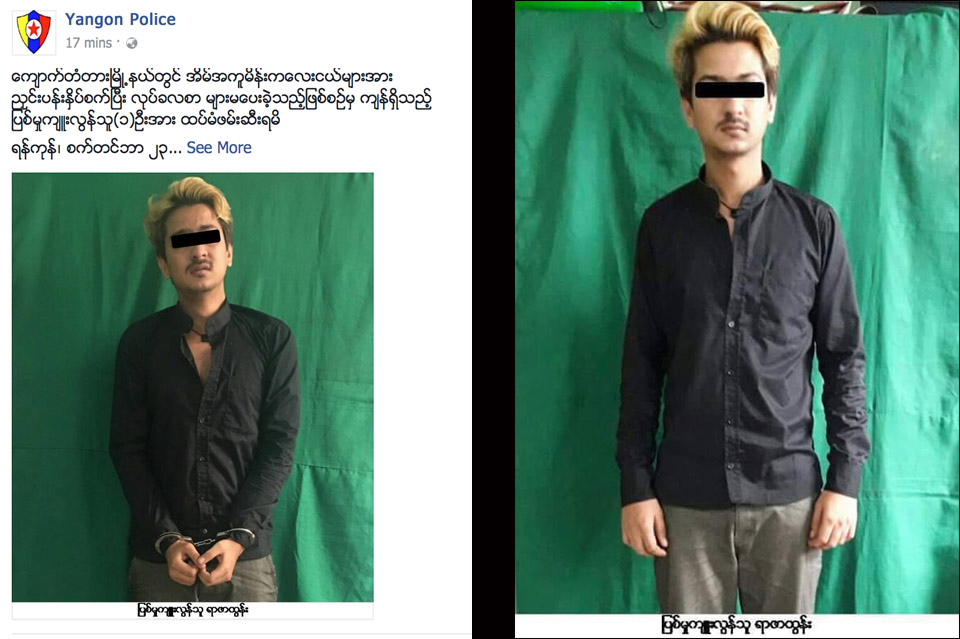 First they uploaded a photo of the 25-year-old man, identified as Yar Zar Htun, without handcuffs. About an hour later after angry comments appeared on their Facebook page, they deleted the photo and uploaded a new one with him in handcuffs.