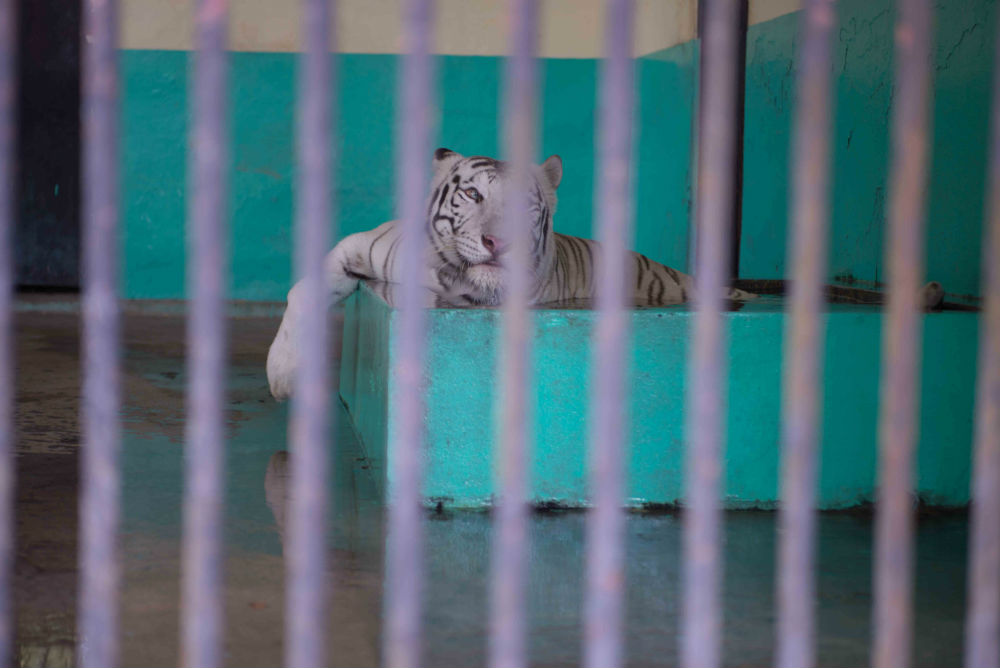 Amid searing heat this morning, dozens of monkeys crowded under the shade of a wooden hutch. The zoo’s sole white tiger sat, panting, in a water bath.