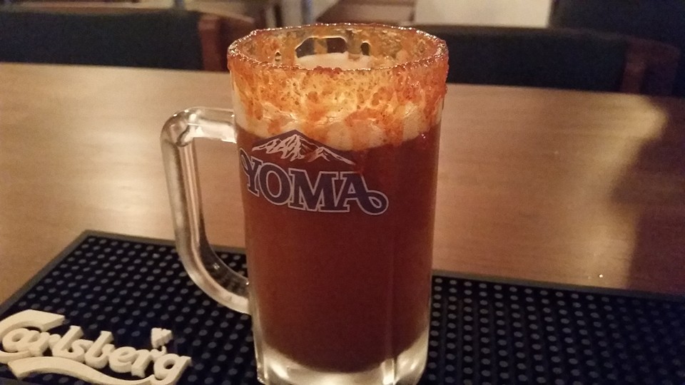 Drinks look authentic and potent, like this Michelada Tamarindo, with a shot of tomato and a chili-lime salt rim.